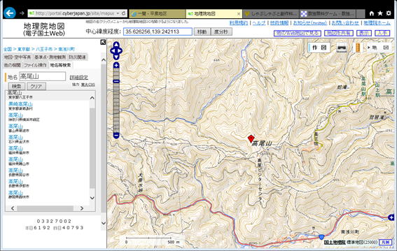 地名のボックスに山の名前等を書いて検索すると、その山の候補がいくつか表示されるので、目的の山名をクリックすると、その山を中心にした地図が表示される。