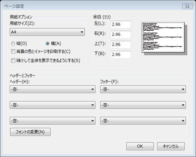 用紙サイズをA4横、左右上下の余白を上図のように2mm程度に小さくし、ヘッダーとフッターを全て「空」にしてOKを押す。その後、もう一度ツールボタンの「印刷」をクリックし、今度は「印刷プレビュー」をクリックすると、下図のような印刷プレビュー画面が表示される。