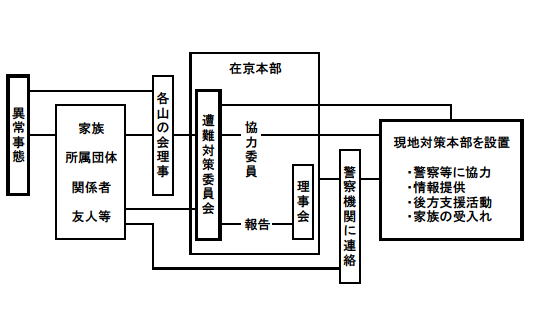 (5) 遭難および事故が発生し、救助要請が必要になった場合には、手順書(ピンチ手帳)に明示されている手順に従い、その要請を行う。そして、これを受けた各会の遭難対策委員(常任理事)は直ちに委員長及び情報・連絡係りにこれを連絡する。その後の活動は規約第29条の規定による。