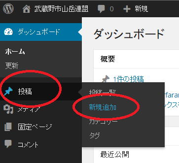 左側メニューの「投稿」→「新規追加」をクリックする。
