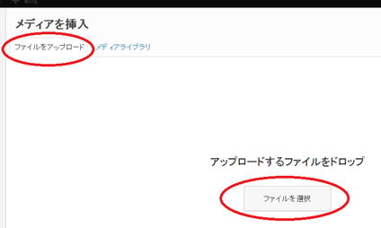 (4)「メディアを追加」をクリックすると、次のような画面になるので、挿入する画像を選択します。「ファイルをアップロード」のタブの「ファイルを選択」をクリックします。