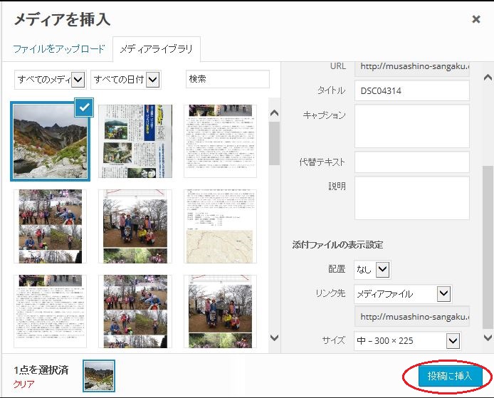 (6)下図のように、「メディアライブラリ」のタブで挿入する画像にチェックがついているので、そのまま、右下の「投稿に挿入」をクリックする。