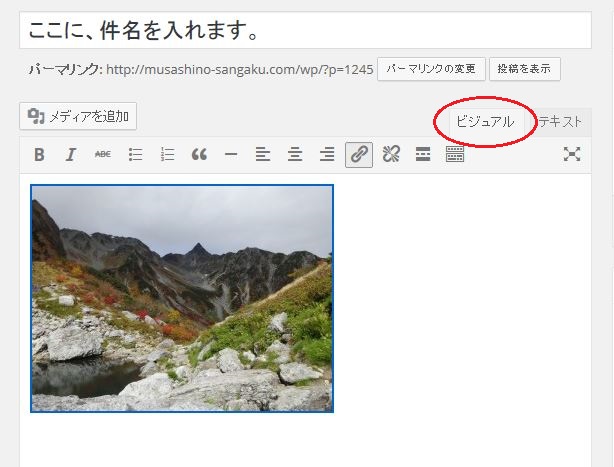 (7)「ビジュアル」のタブをクリックすると、記入した記事本文や挿入した画像のイメージがわかります。