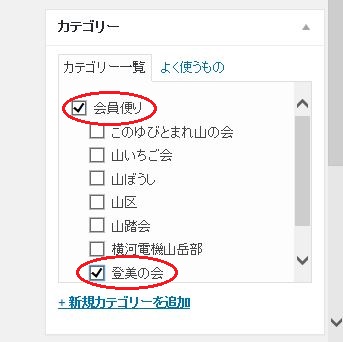 (8)右下の「カテゴリー」で、「会員便り」と(自分の所属する会)に、チェックマークを入れます。